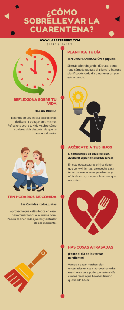 - El COVID-19 nos ha obligado a todos a estar encerrados en casa forzosamente. Nunca hemos estado tan cerca de los nuestros y sin poder escaparnos a ningún lado. Aprovecha este tiempo maravilloso que quizás nunca se vuelva a repetir para acercarte más emocionalmente a tus hijos y a tu pareja. Si vives solo, utiliza las tecnologías para hacer videollamadas a tus seres queridos y amigos. Mejor videollamadas que llamadas ya que verles y oírles será más reforzante que sólo oírles por teléfono.
